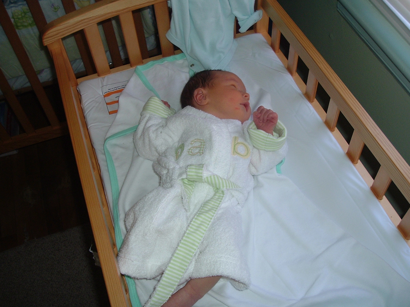 Warren posing in one of the few new outfits we bought for him. He is in his bathrobe, ready to take his first bath. |